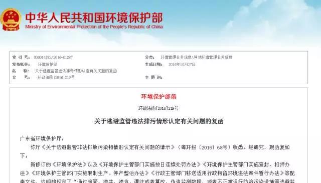 广东省环境保护厅: 你厅《关于逃避监管非法排放污染物情形认定有关问题的请示》(粤环报〔2016〕68号)收悉。经研究,...